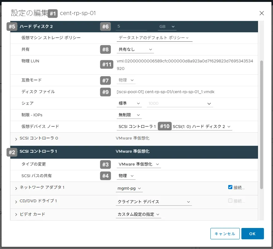 | 4 | BusSharingMode | SCSI バスの共有 | RDM ディスクの接続先となる SCSI コントローラの SCSI バス共有 (なし / 物理 / 仮想) | Physical |