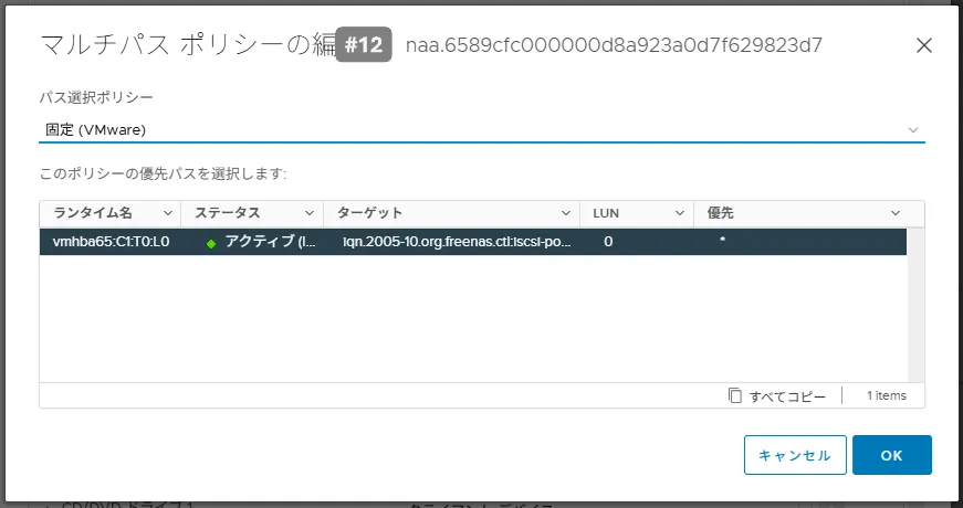 | 12 | ScsiCanonicalName | 物理 LUN 識別子 | RDM のマッピング先となる物理 LUN のストレージにより提供される一意な識別子 naa (Network Addressing Authority) 、EUI (Extended Unique Identifier) | naa.6589cfc000000d8a923a0d7f629823d7 |