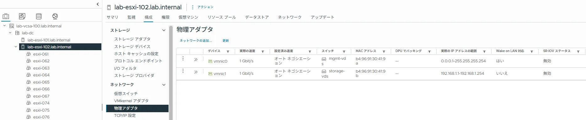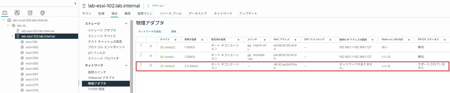 vSphere Client に administrator@vsphere.local ユーザーでログインし、 [インベントリ] - [ホストおよびクラスタ] - [<対象 ESXi ホスト>] - [構成] - [ネットワーク] - [物理アダプタ]を選択し、現在認識されている NIC を確認